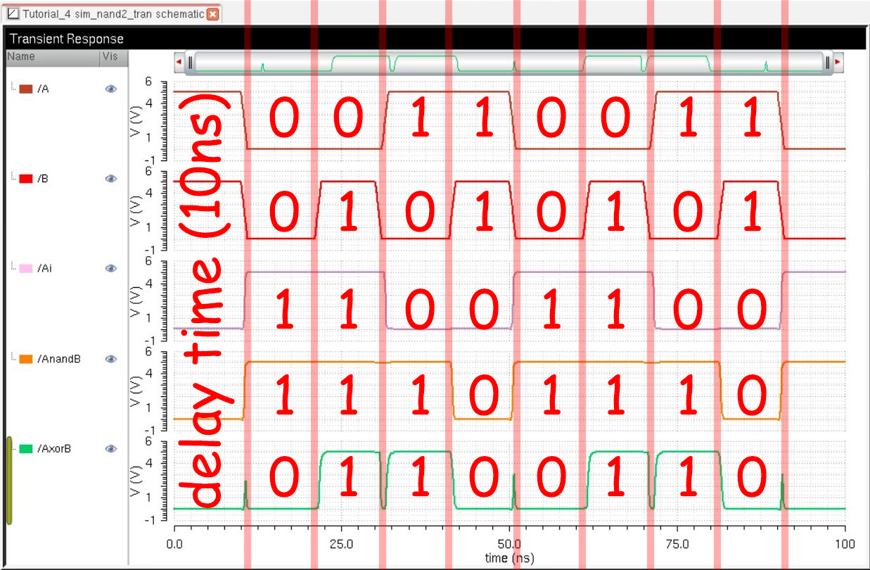 In order to better convey how the above transient simulation results verify the operation of the circuits, I will include the following truth tables for NAND, XOR, and Inverter gates alongside an edited version of the simulation results image that displays all of the logic values.