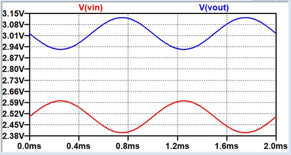 are swinging around 2.5V. The gain we are using is 1, (5k/5k). If the input has