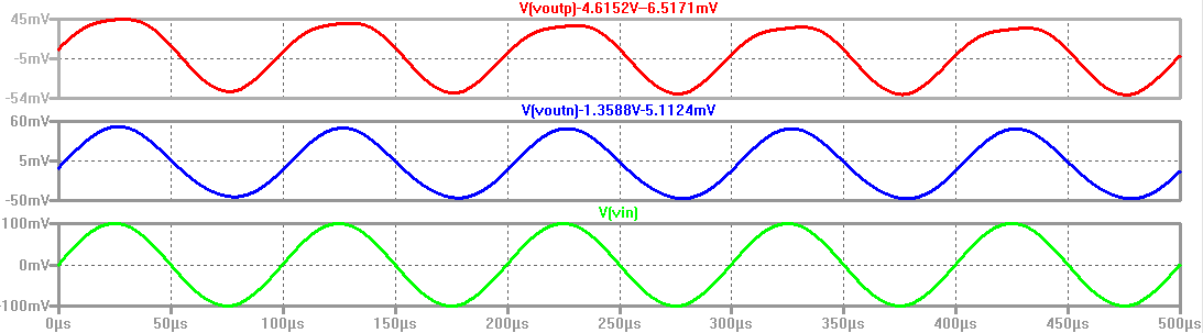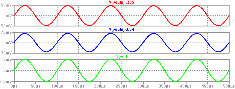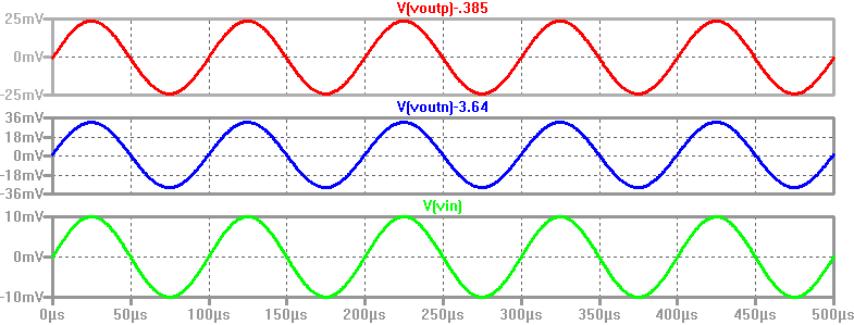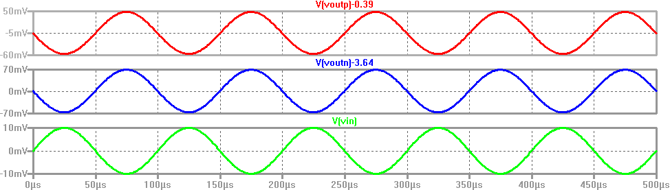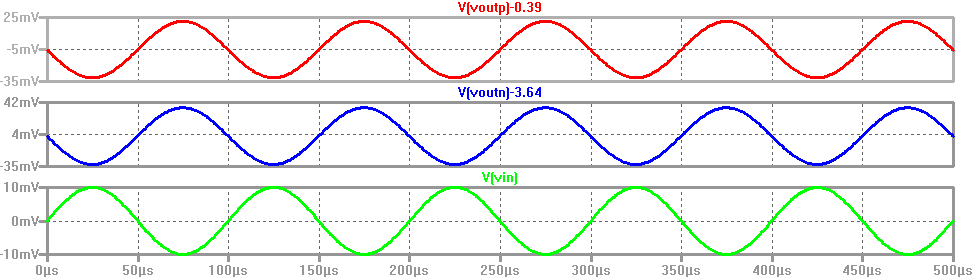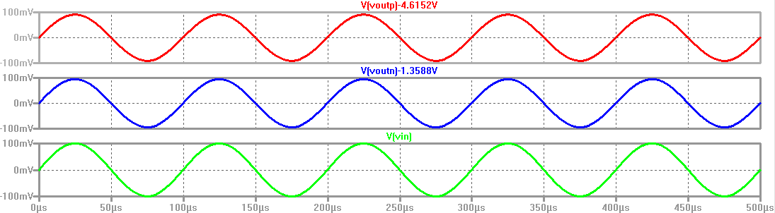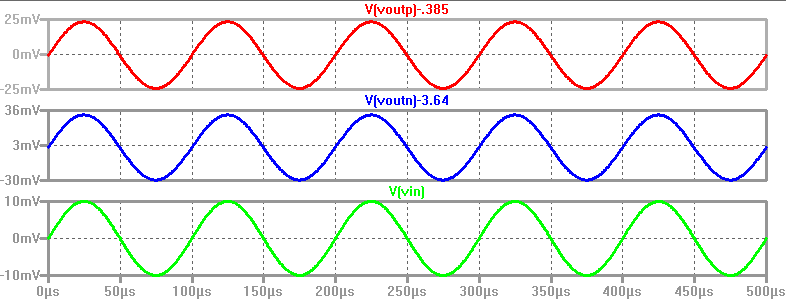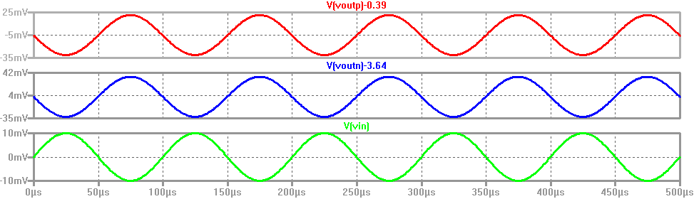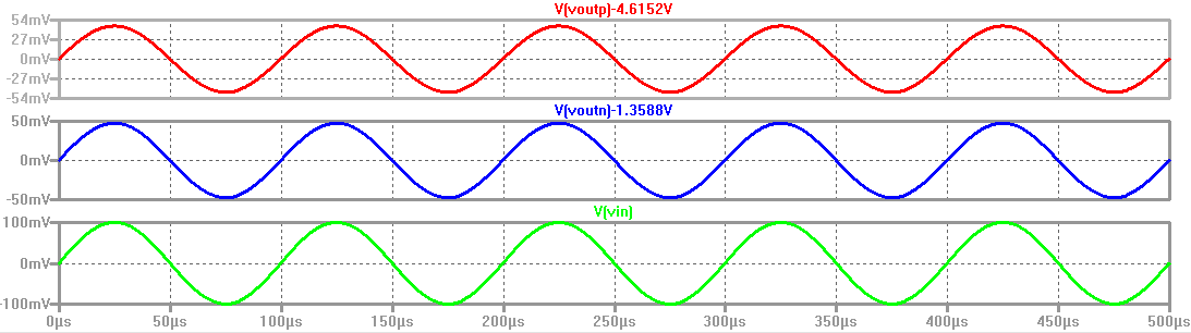 It can be seen from the simulation below that Voutn and Voutp are equal to Vin, meaning that the gain is 1V/V.