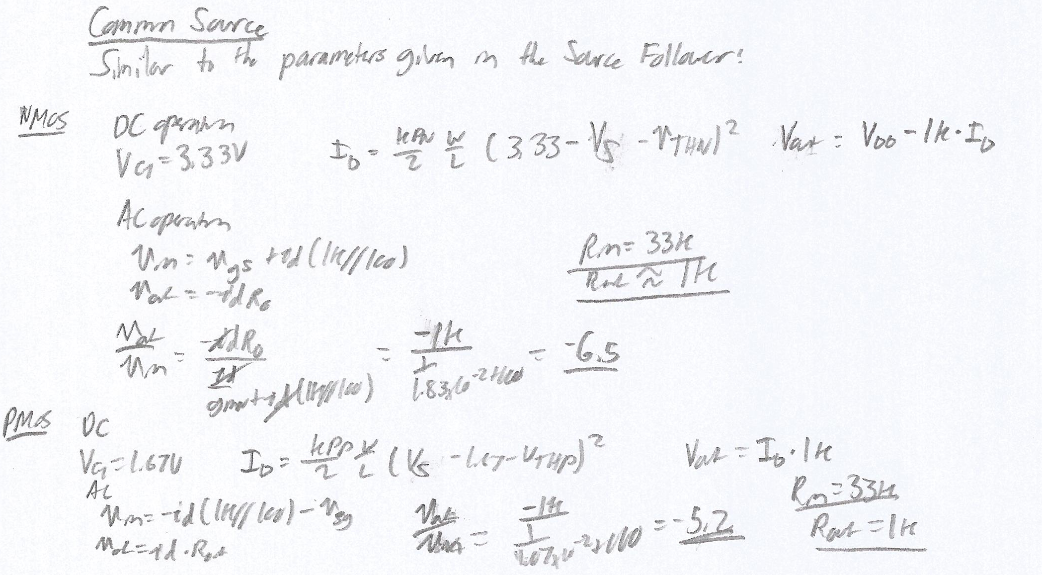 The following hand calculations illustrate the DC and AC operation of the Common Source amplifier: