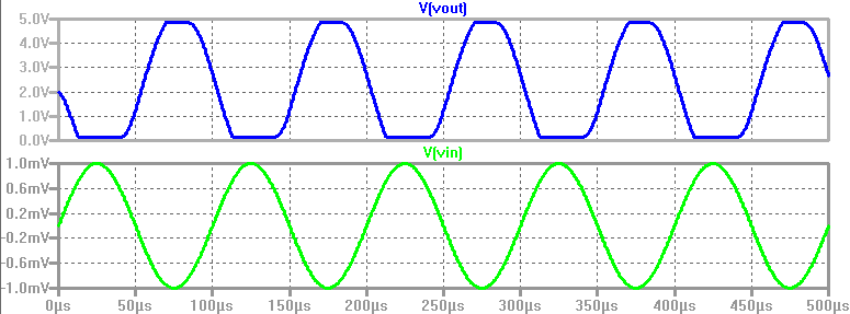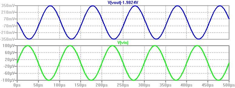 For a 100uV input, a 350mV output is generated (with a 180 degree phase shift). This corresponds to a gain of -3500.