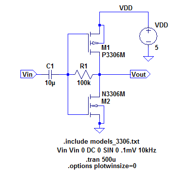 of the amplifier is so high that the transistor saturates at VDD and