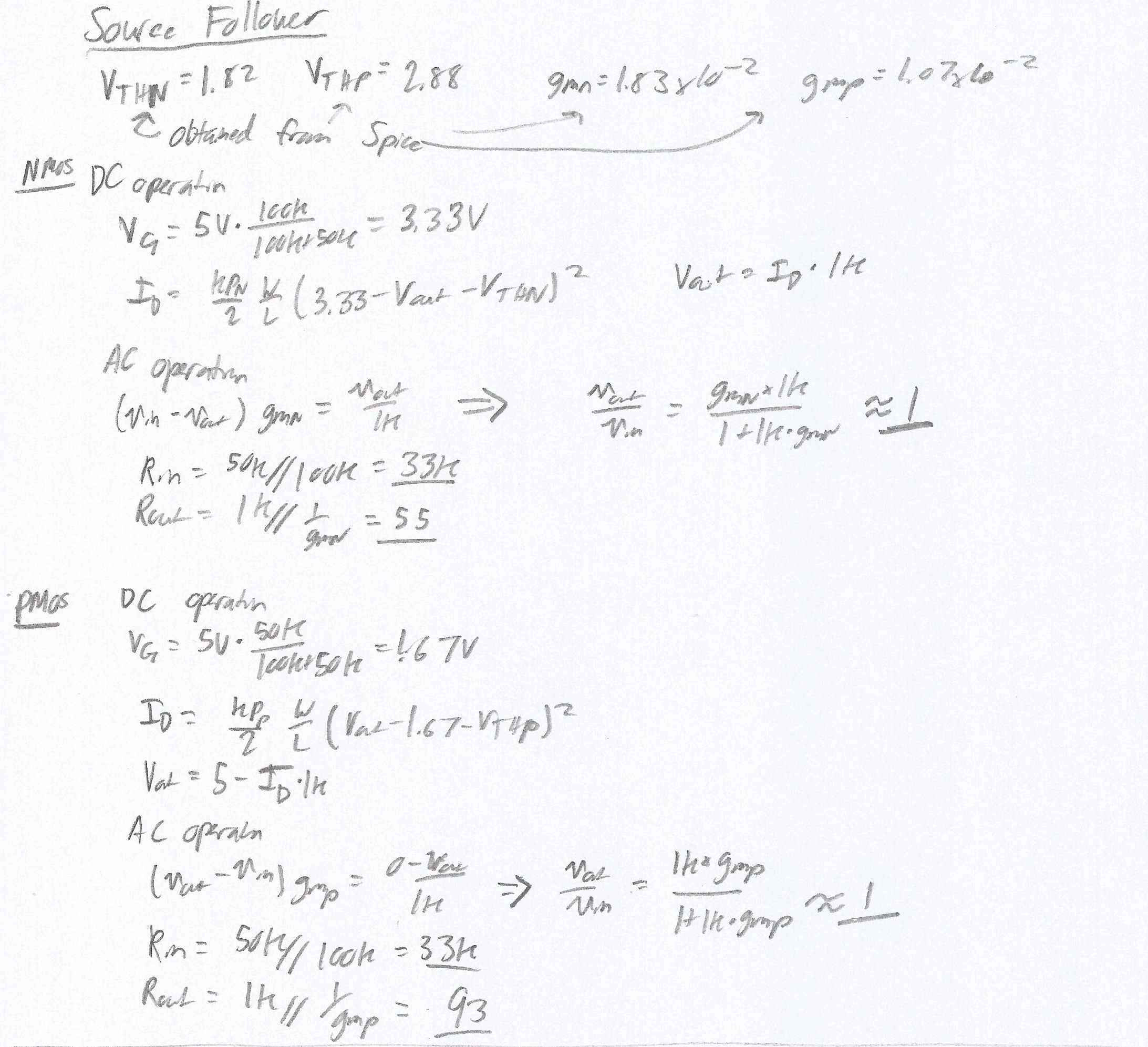 The following hand calculations illustrate the DC and AC operation of the Source Follower.