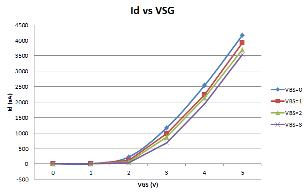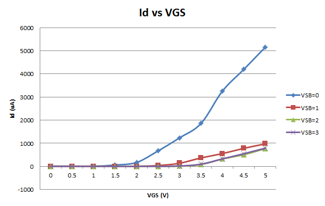 - ID vs VGS (0<VGS<5V) with VDS=5V for VSB varying from 0 to 3V