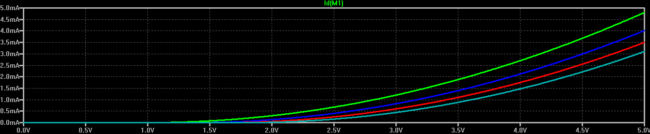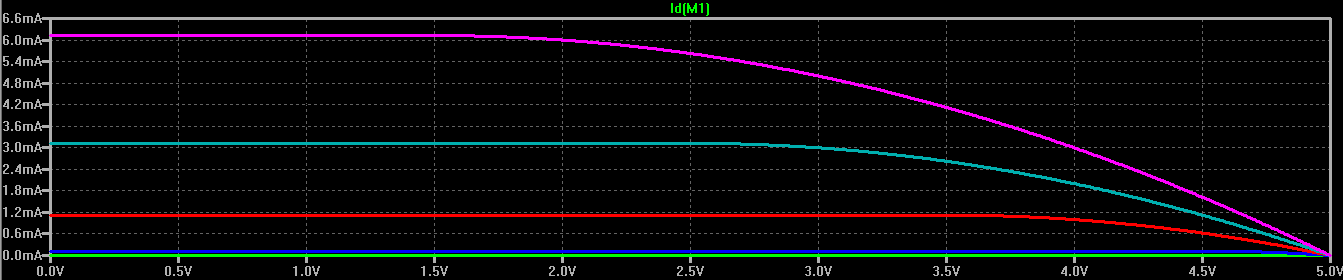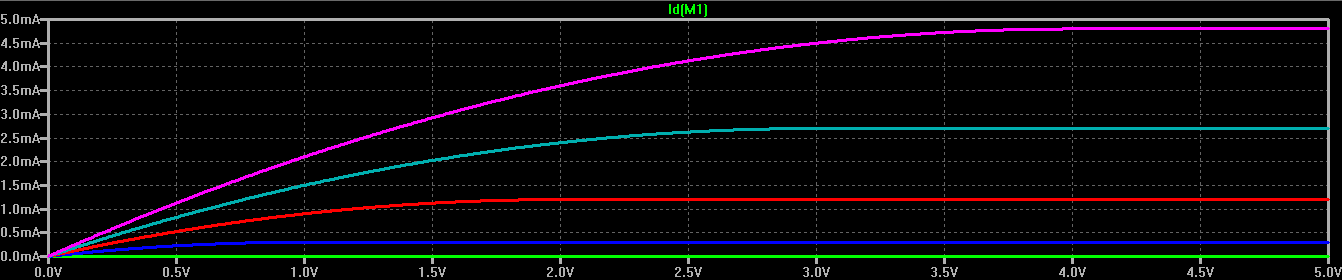 ID vs VDS (0<VDS<5V) for VGS varying from 1V to 5V