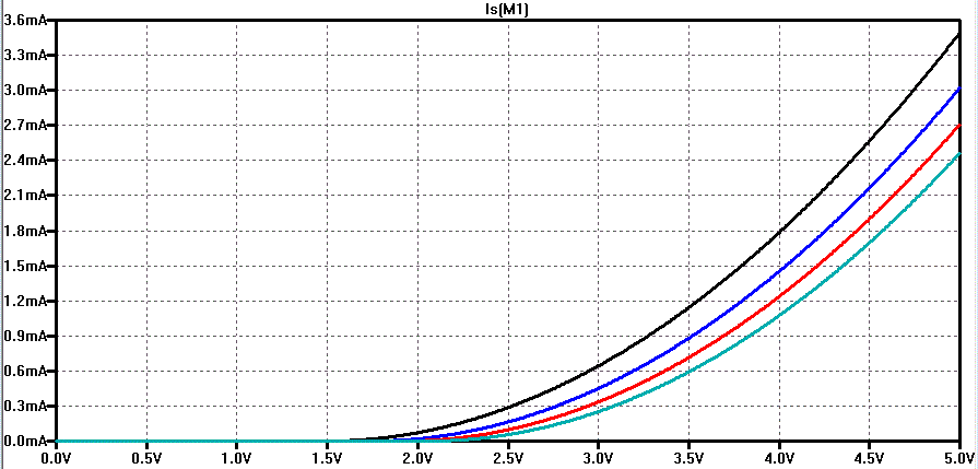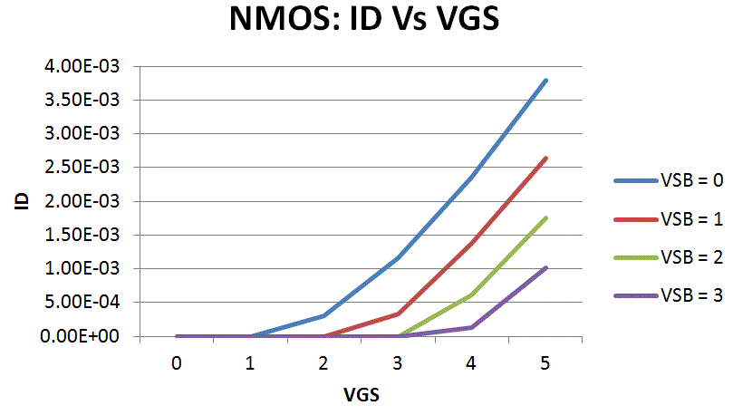- ID v. VGS (0 < VGS < 5 V) with VDS = 5 V for VSB varying