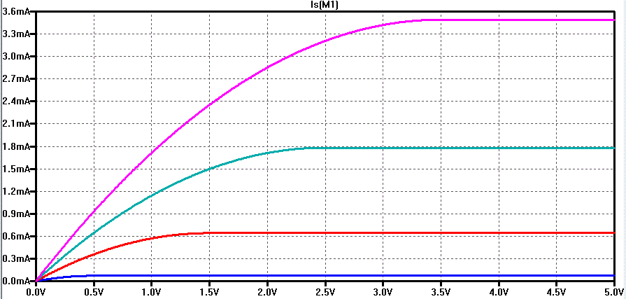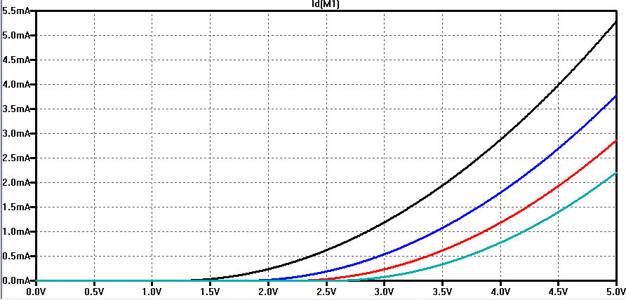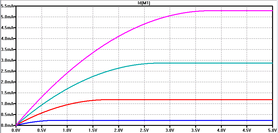 - ID v. VDS (0 < VDS < 5 V) for VGS varying from 1 to 5 V