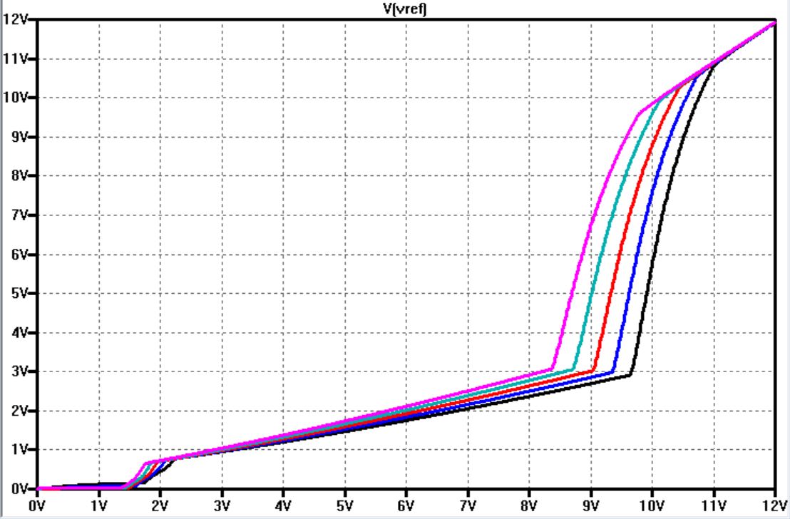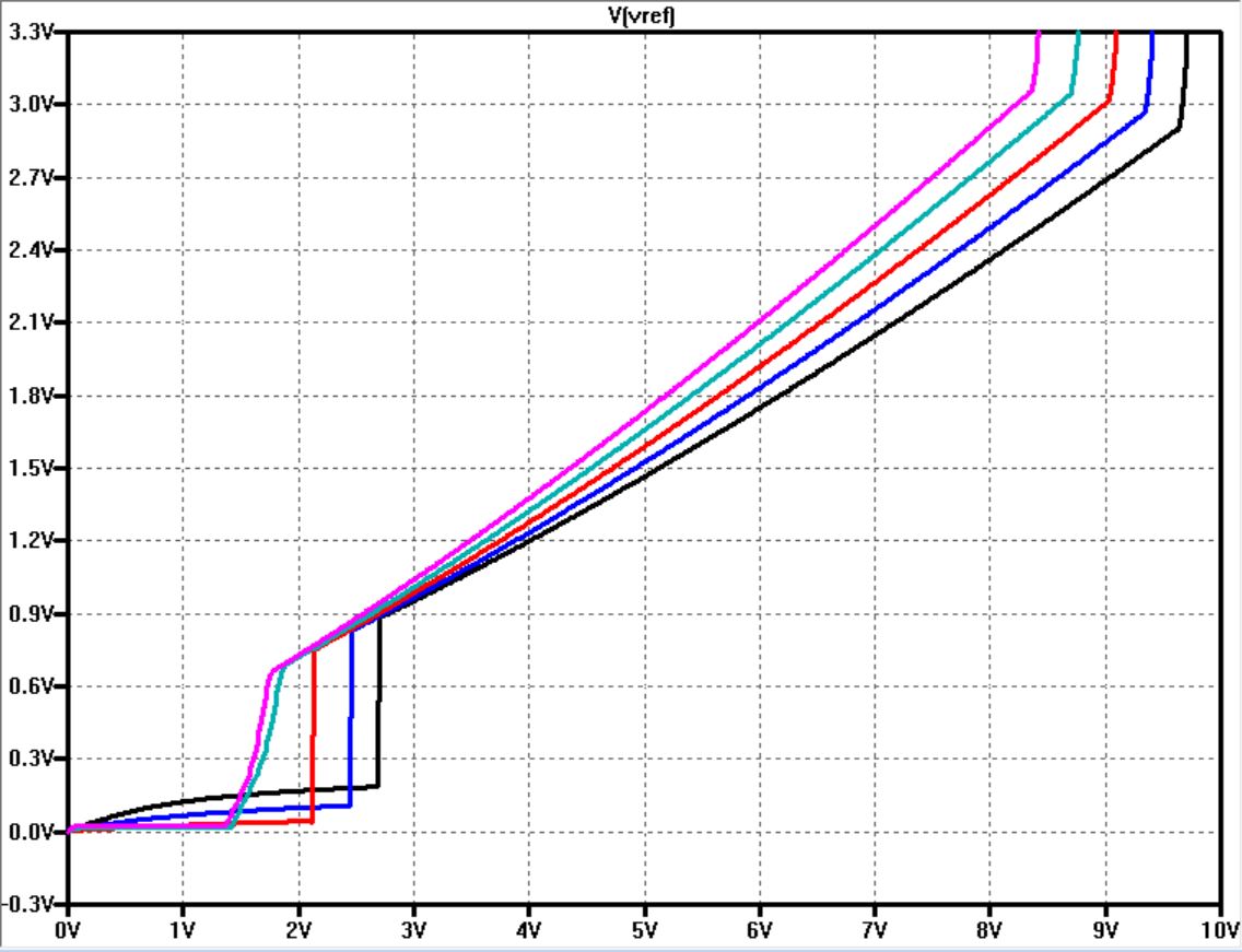 We were able to obtain very close results to that of our LTSpice simulations that were developed in 'Lab 8' for the CD4007 MOSFET arrays. This document can be found here. We were able to sweep VDD and measure both the current (Iref) through the structure as well as the voltage at Vref. We did have to add a 'Lambda' value of 0.5 in our spice model to account for channel length modulation. This gives us a more realistic result. According to the plots below, we achieved a Vref increase of approximately 282 mV, and an Iref increase of 442 nA per 1V increase in VDD. Experimentally, it is very difficult to test the dependence of Iref and Vref with respect to temperature, but one can get an idea by the simulations below.