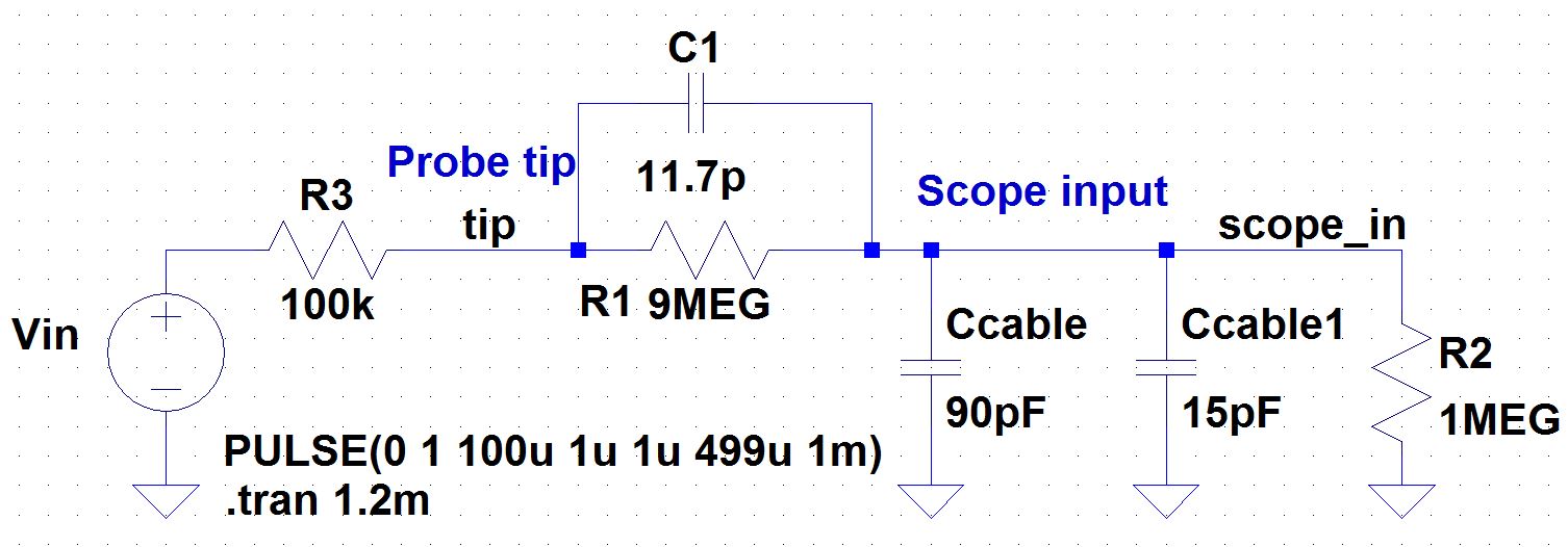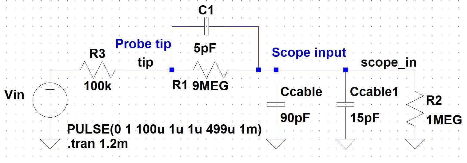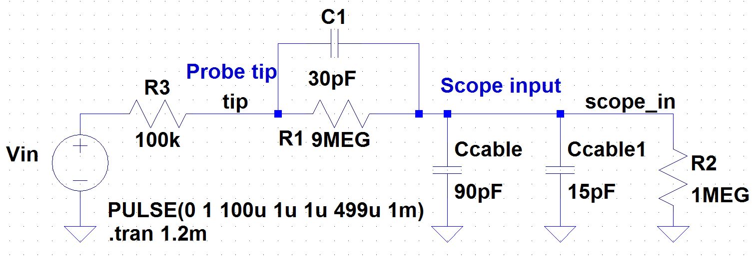 - Vary the parameters in the simulations found in probe.zip to ensure you understand the operation of a compensated 10:1 scope probe.