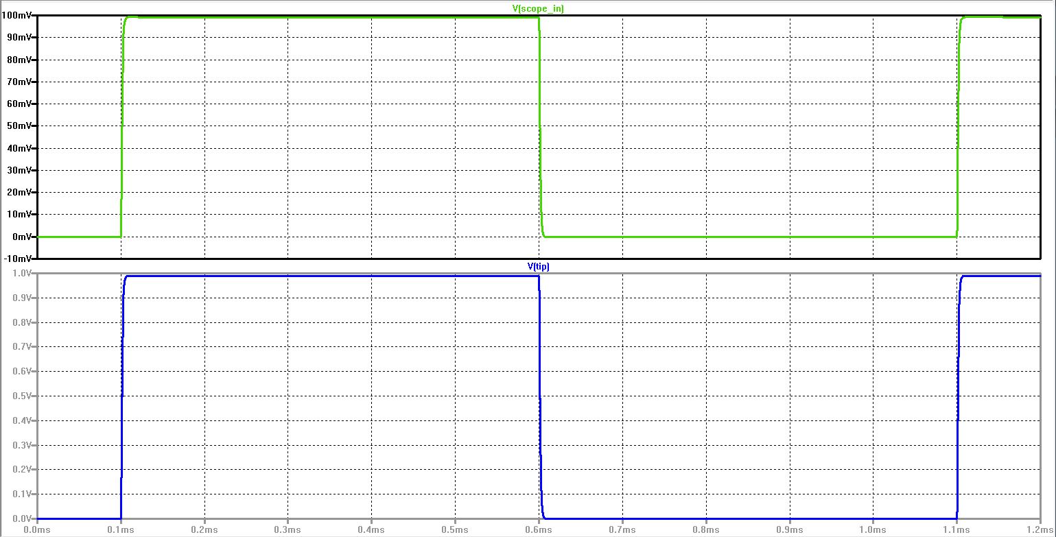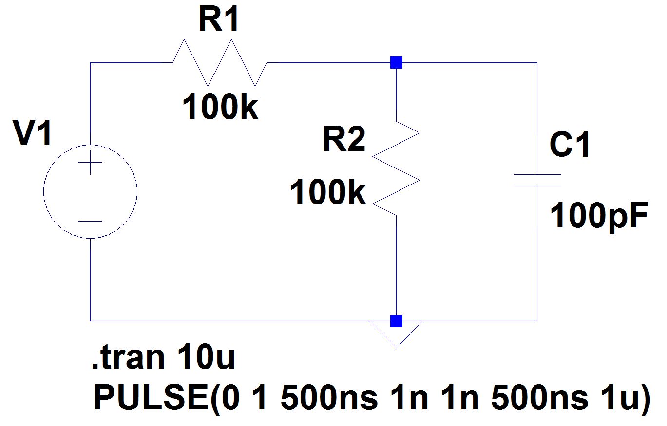 100k resistors. Apply a 0 to 1 V pulse at 1 MHz to the divider's input.