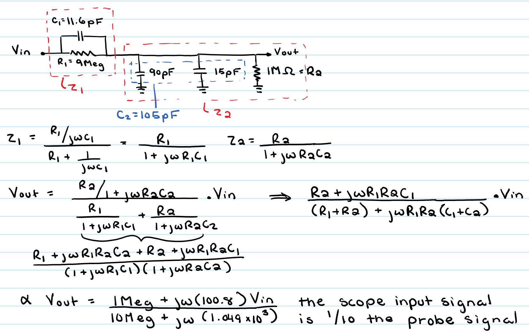 Draft the schematic of a 10:1 scope probe, perform the circuit analysis