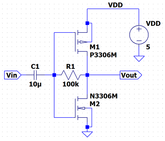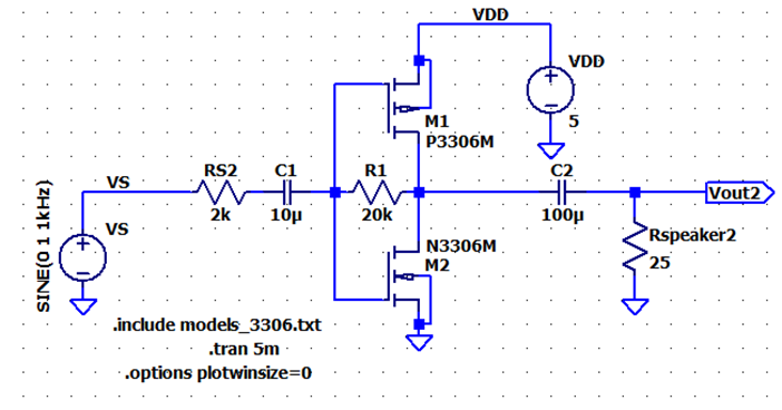 input of the amplifier), a 20kΩ at the gate-drains of the MOSFETs, and inputting an 25Ω speaker.