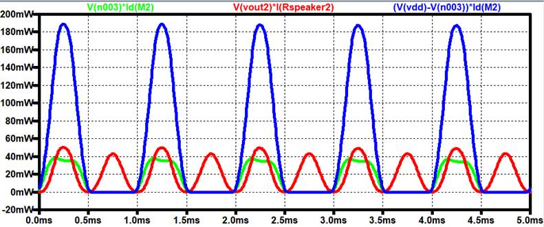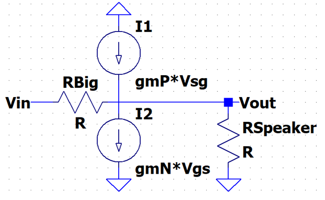 [ ( Vin – Vout ) / Rbig ] + gmP*Vsg = gmN*Vgs + [ Vout / Rspeaker ]