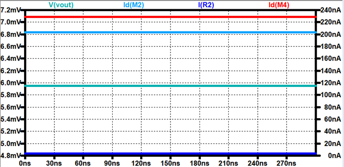 can see that the NMOS current mirror current (Cyan) and the