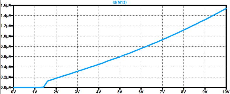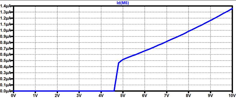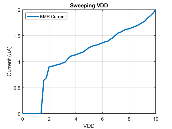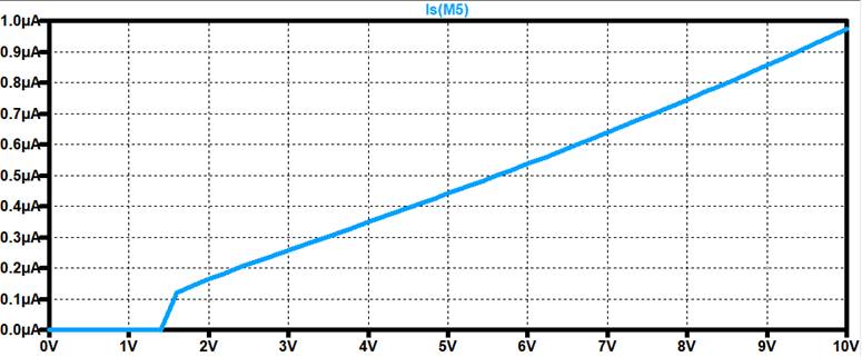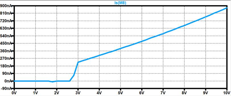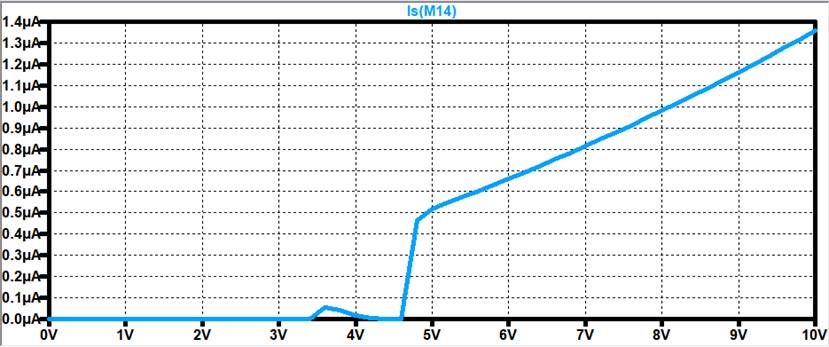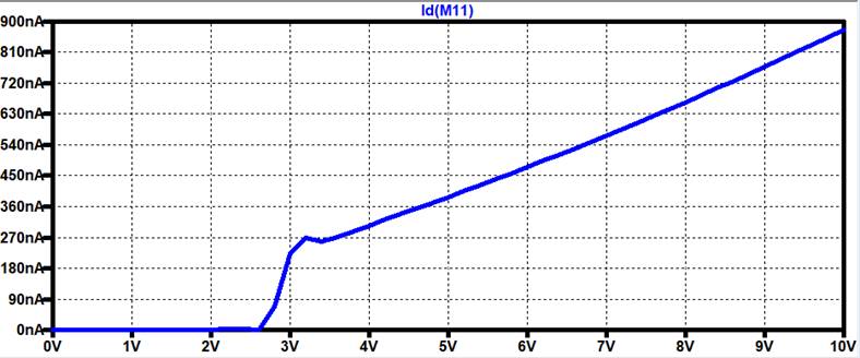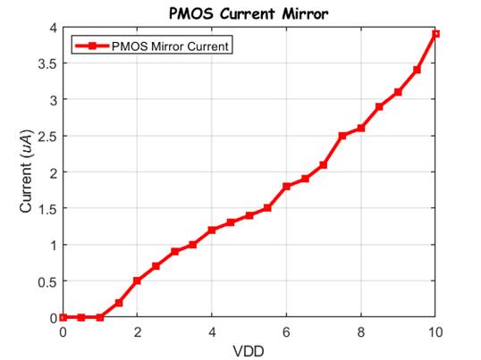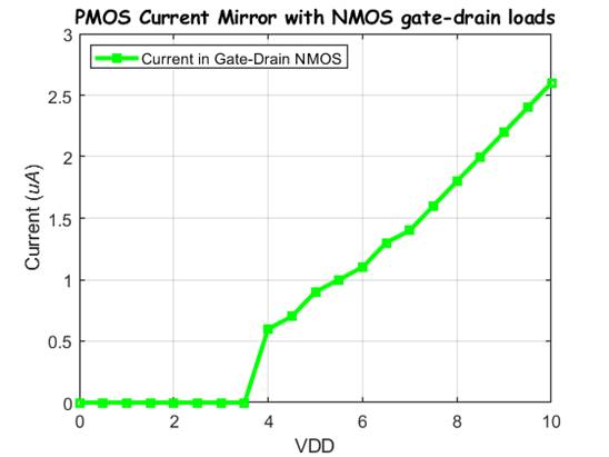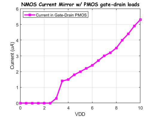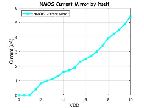 measuring the current of the Current Mirror as we sweep VDD from 0V-10V.
