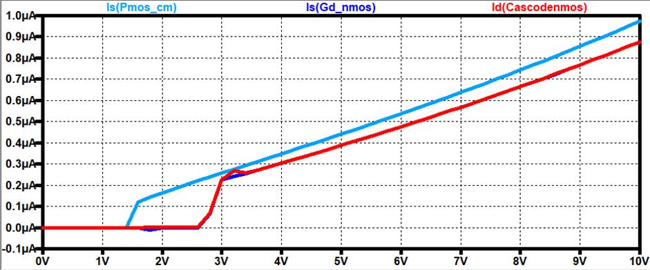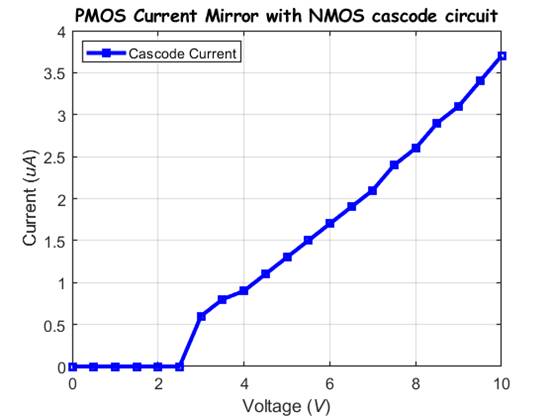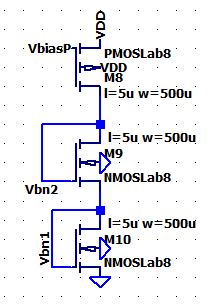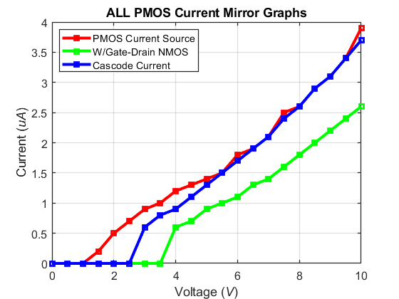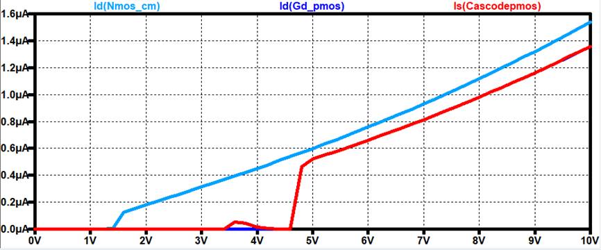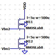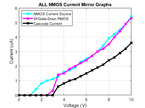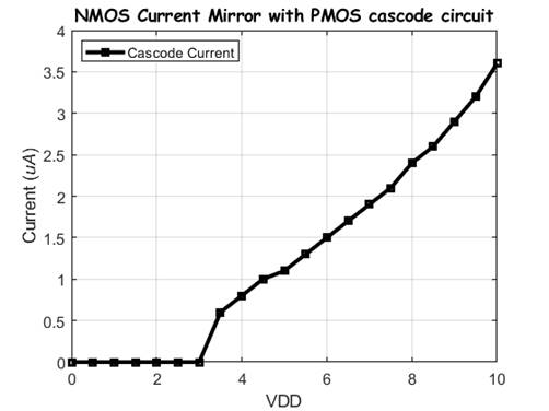 connected NMOS devices. We will be measuring the current of the Cascode NMOS current mirror as VDD sweeps from 0V-10V.