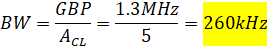 Calculated bandwidth with gain of 5 using the non-inverting topology.
