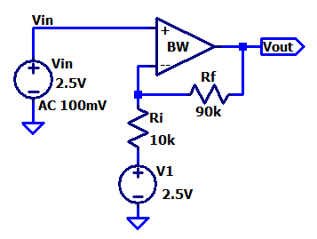 Calculated bandwidth with a gain of negative ten using the inverting topology.