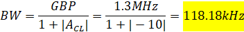 Calculated bandwidth with gain of 10 using the non-inverting topology: