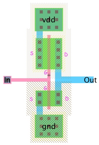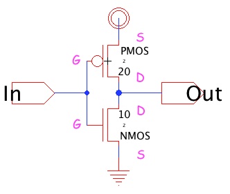 is at least 2 (No changes from Lab 4 in this case). - Place the PMOS above the NMOS, connect the their gates with an arc and connect