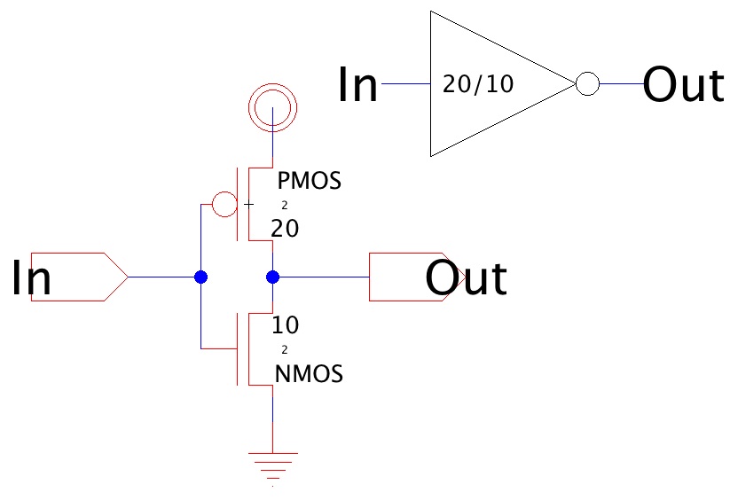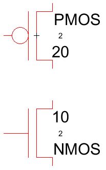 the Drain terminals of the MOSFETs with an arc. - Add power node and ground node to the cell, change the sizes of the nodes to match