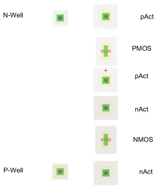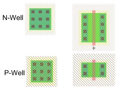 - N-Well, P-Well: set x and y sizes to 18 by 15