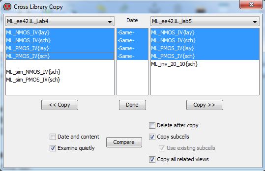 - From the Lab 4, copy the NMOS_IV and PMOS_IV cells to the library for this lab.