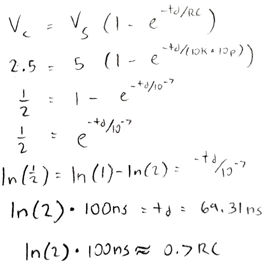 There will be a delay created by the charing of the capacitor. The time delay should be equal to 0.7RC. As seen previously, our output resistance is 10k Ohms, and the capacitor is 10pF. This means that the time delay should be about 0.7 * (10^4 * 10^-11) or about 70ns. We can see the hand calculations done below.