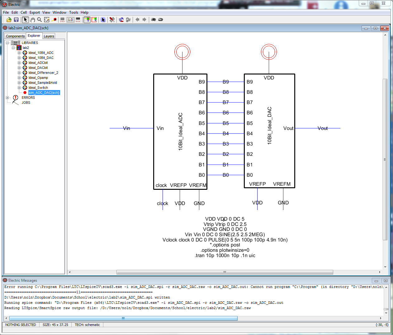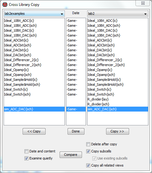To begin, open Electric and create a new library, if you haven't done so already. You can find the New Library option under the File menu. For this prelab, we will be using a analog-to-digital converter simulation example found in lab2.jelib. Open lab2.jelib and go to Cell > Cross Library Copy... Here, choose sim_ADV_DAC{sch} from lab2 and copy it to your current library. Be sure that "Copy subcells" and "Copy all related views" are checked at the bottom of the window. Click done to add the cell to our library.