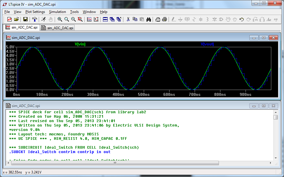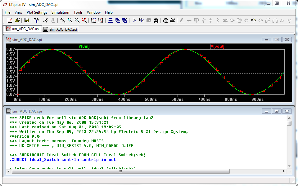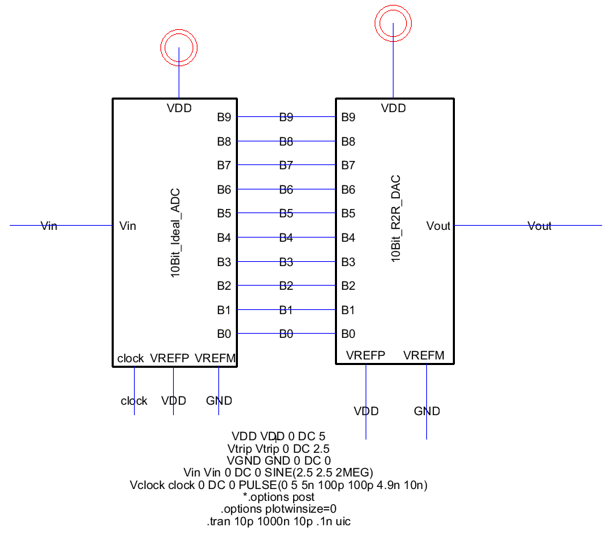 Double clicking the newly added "sim_ADC_DAC{sch} file in your library will open the schematic cell. You should see it shown in your main window, as seen below.