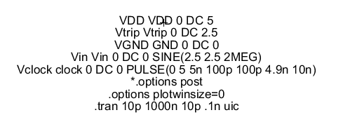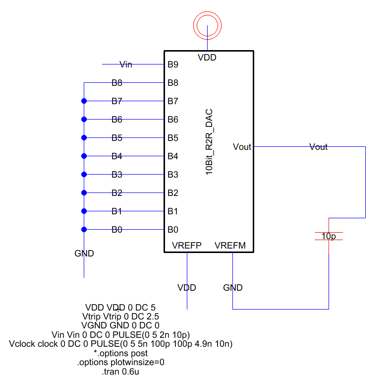 Next we will see how our DAC performs when connected to a capacitor load of 10pF. The lower 9 bits of the DAC will be connected to ground, or logic 0, and the uppermost bit will be connected to a DC pulse voltage source (as seen below).