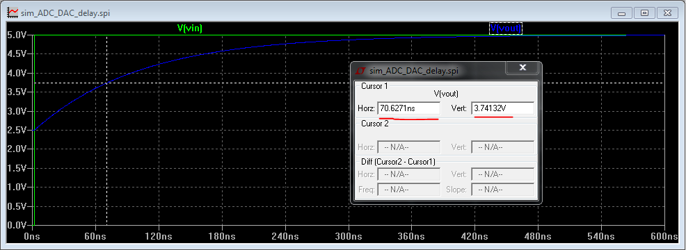 The results of the simulation can be seen below. At about 70ns, Vout is equal to about 3.75V, halfway between the starting voltage of 2.5V and the full 5V.