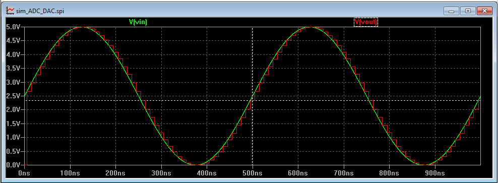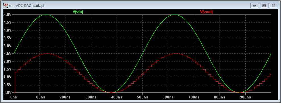Next we want to ensure that the DAC we created works as functioned. We replace the Ideal DAC in our test schematic with our R-2R DAC. You can see the full schematic below.