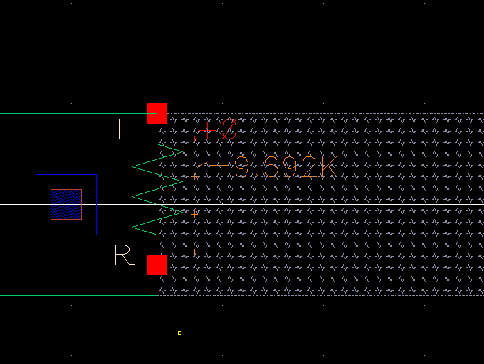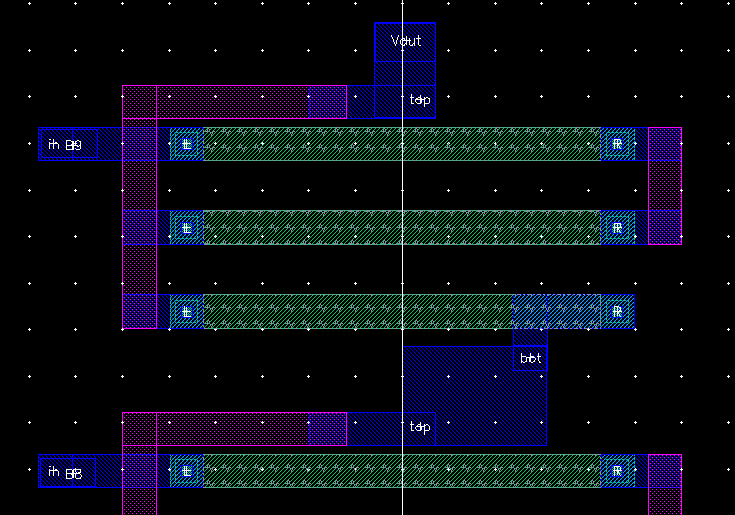The first step is to layout the resistors with minimum spacing, and adding metal1 rectangles that lead to the pins for in, top, and bot.