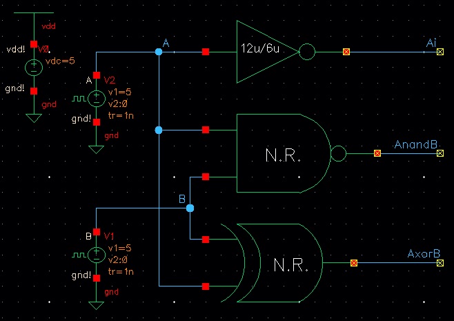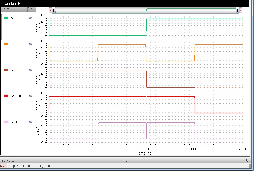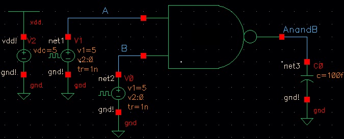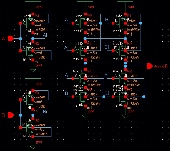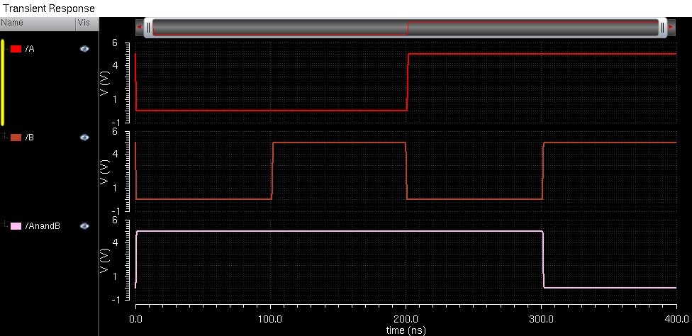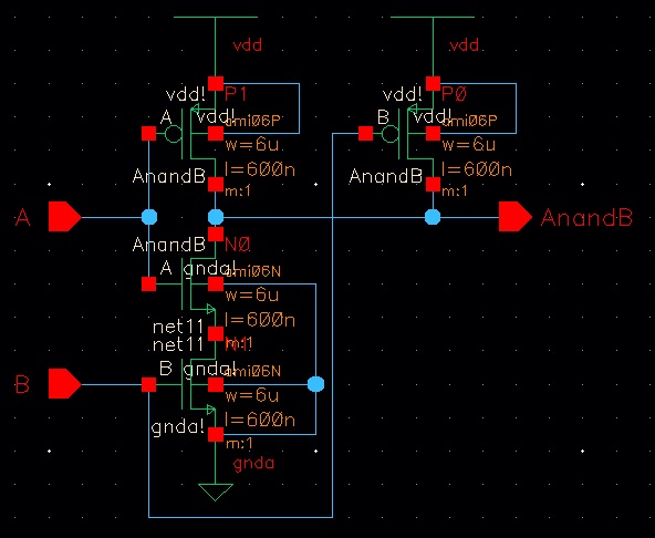 This lab will go over the design, simulation and layout of a CMOS NAND gate, XOR gate, and Full Adder. The lab begins with completing Tutorial 4 seen here. Seen below are the images from the completion of Tutorial 4.