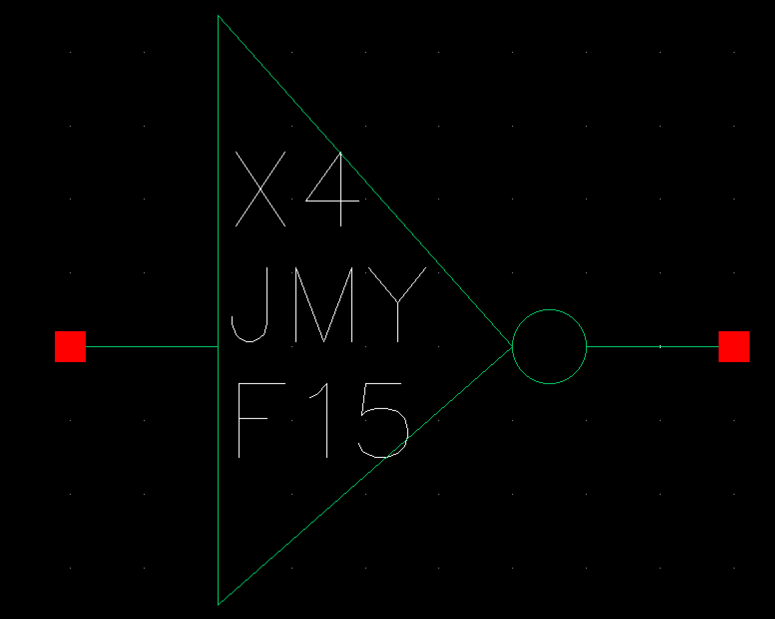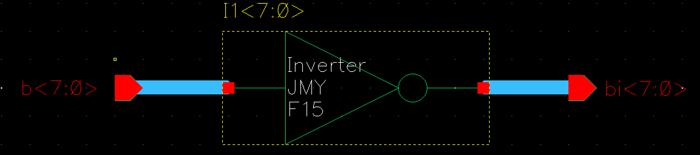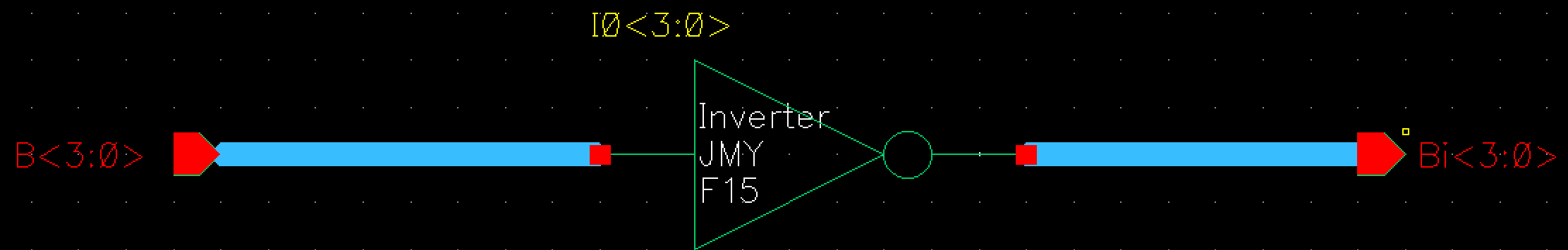 This image shows the schematic of a 4-bit inverter which was created with arrays and buses. Note: The symbol is that of the inverter schematic, as discussed above.