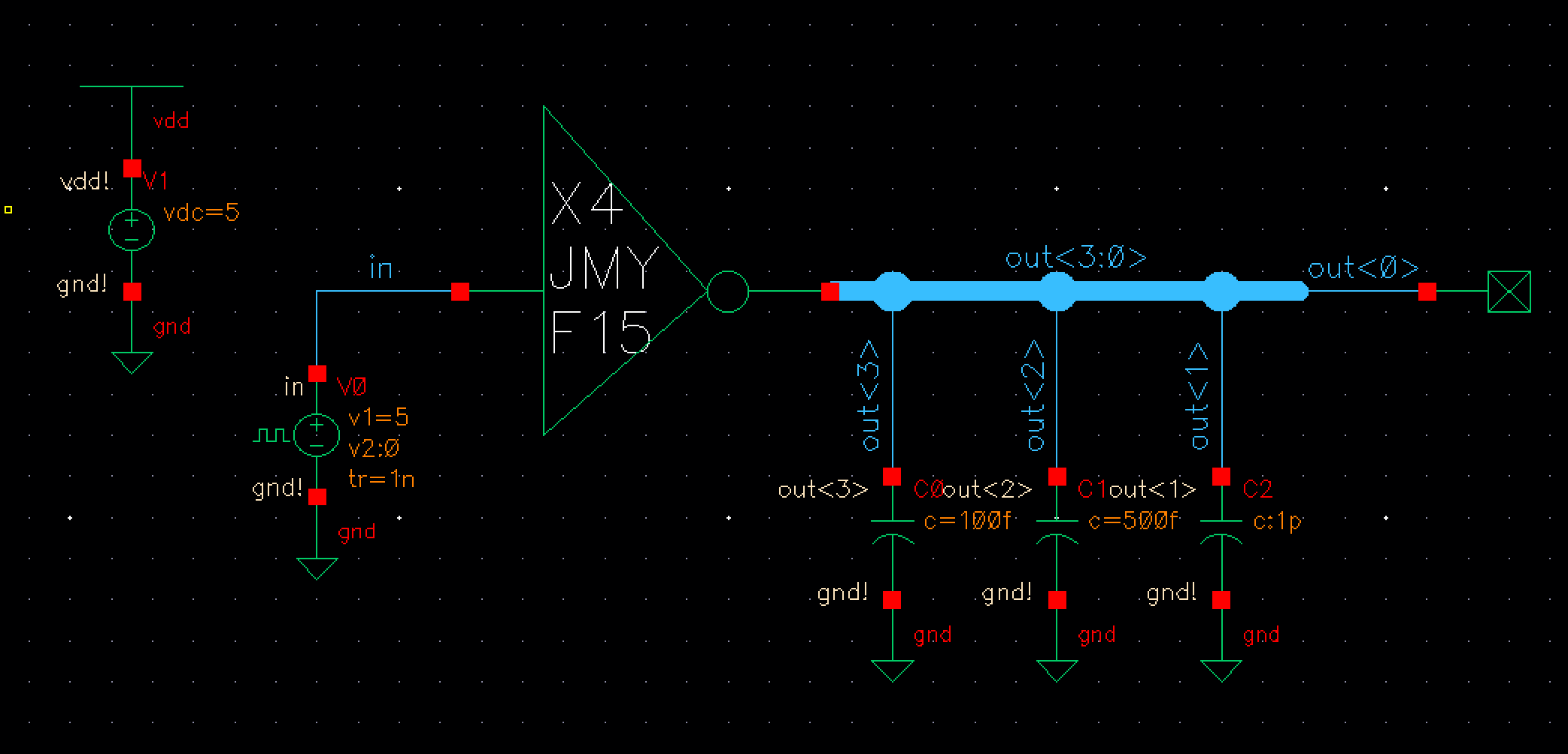 This is the schematic which will be used for testing the 4-bit inverted. There are four different load types connected to the inverter. The first <3> carries a 100fF load, the second <2> carries a500fF load, the third <1> carries a 1pF load, and the fourth <0> carries no load.