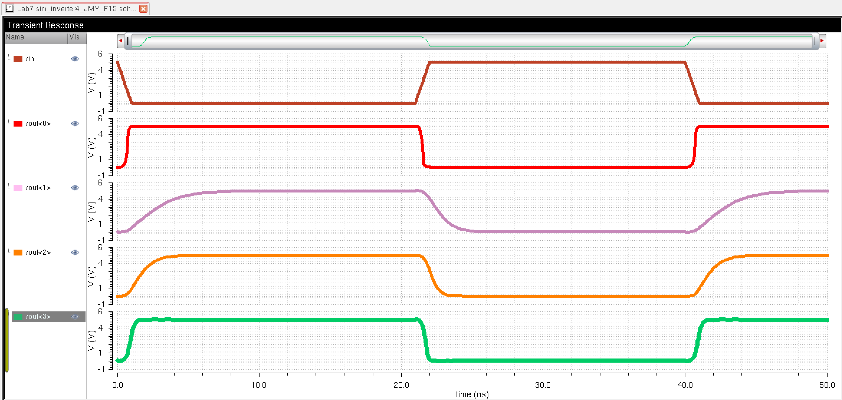 2. Show, in your lab report, how a capacitive load influences the delay and rise/fall times. For the creation of a 4-bit inverter.