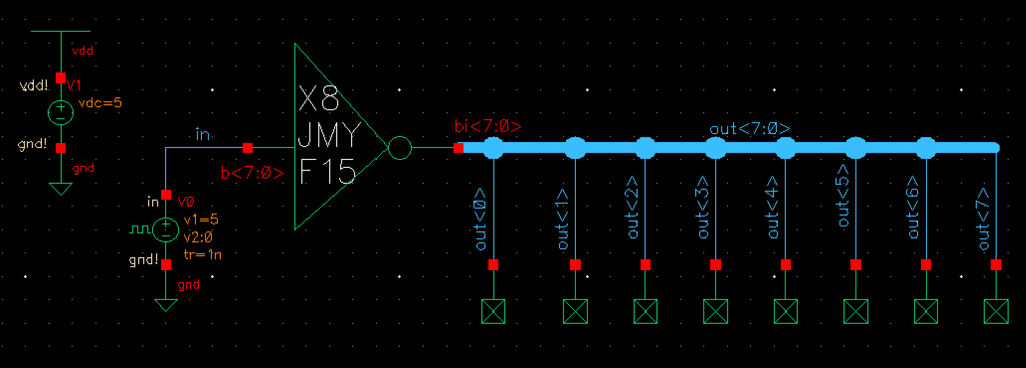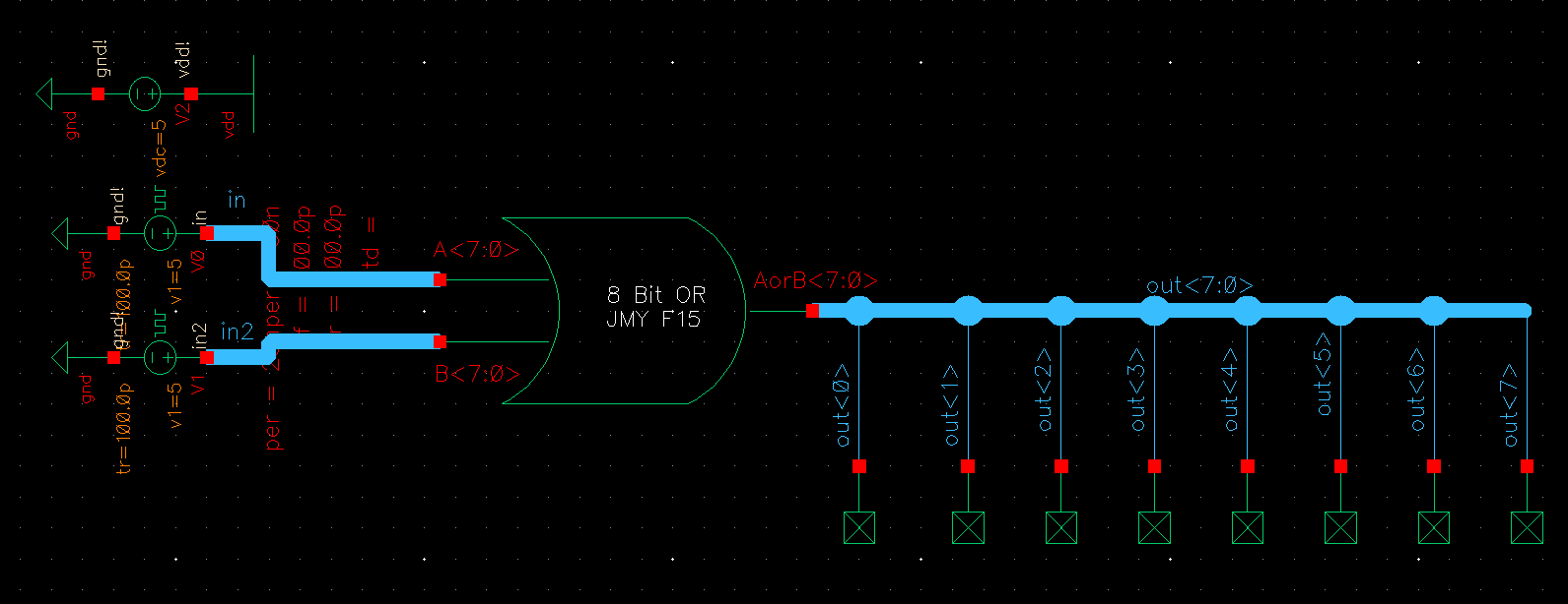 3. Create schematics and symbols for an 8-bit input/output array of: NAND, NOR, AND, inverter, and OR gates.