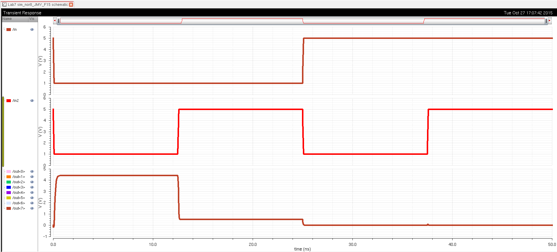 This image shows the successful simulation of the 8-bit NOR gate schematic seen in the previous figure. Note: This simulation tests the following conditions: 00, 01, 10, and 11.