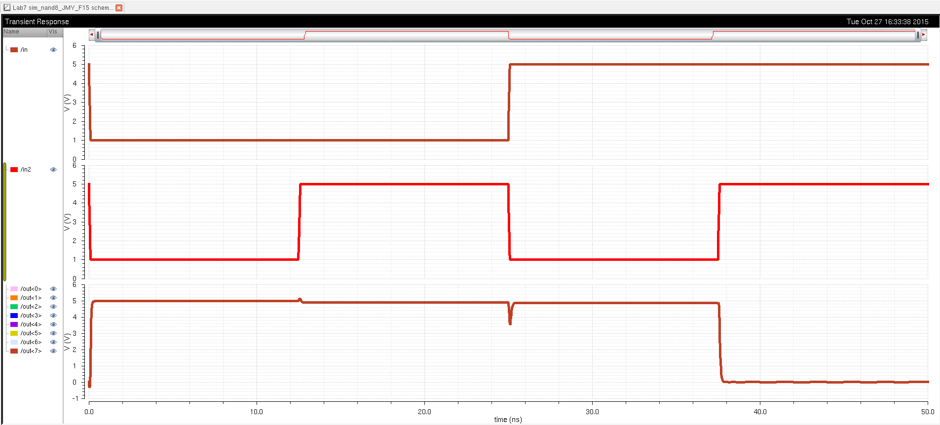 This image shows the successful simulation of the 8-bit NAND gate schematic seen in the previous figure. Note: This simulation tests the following conditions: 00, 01, 10, and 11.