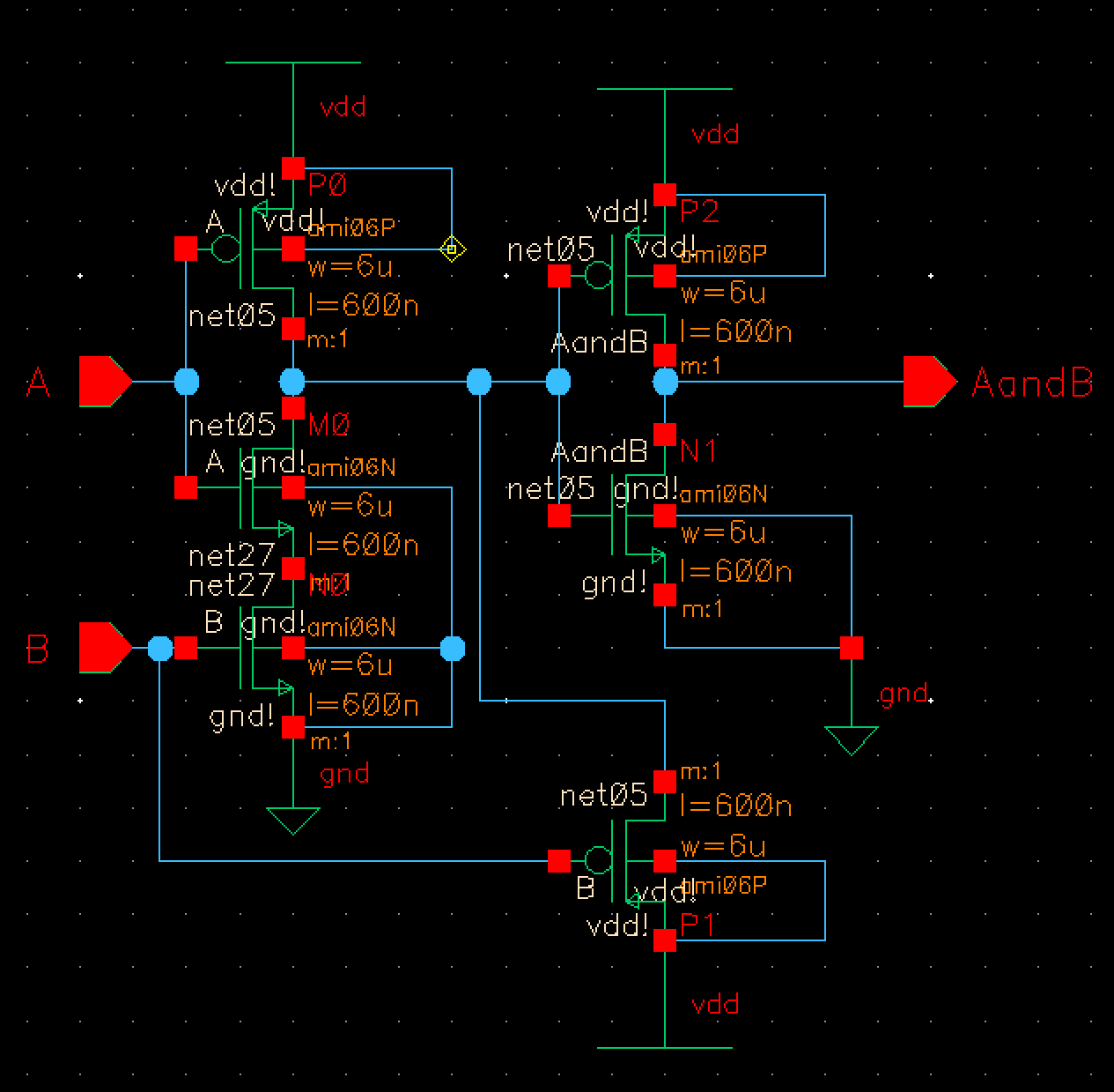 This lab demonstrates how to create a schematic, symbol, simulation schematic, and simulations for common gates (AND, OR, NAND, NOR, and Inverter) in their standard configuration and in an 8-bit configuration. This is accomplished by using buses and arrays in their respective designs. This lab also includes the design of a mux/demux in 2-bit and 8-bit configurations, as well as a full adder in both 1-bit and 8-bit configurations, including the layout of the 8-bit configuration.