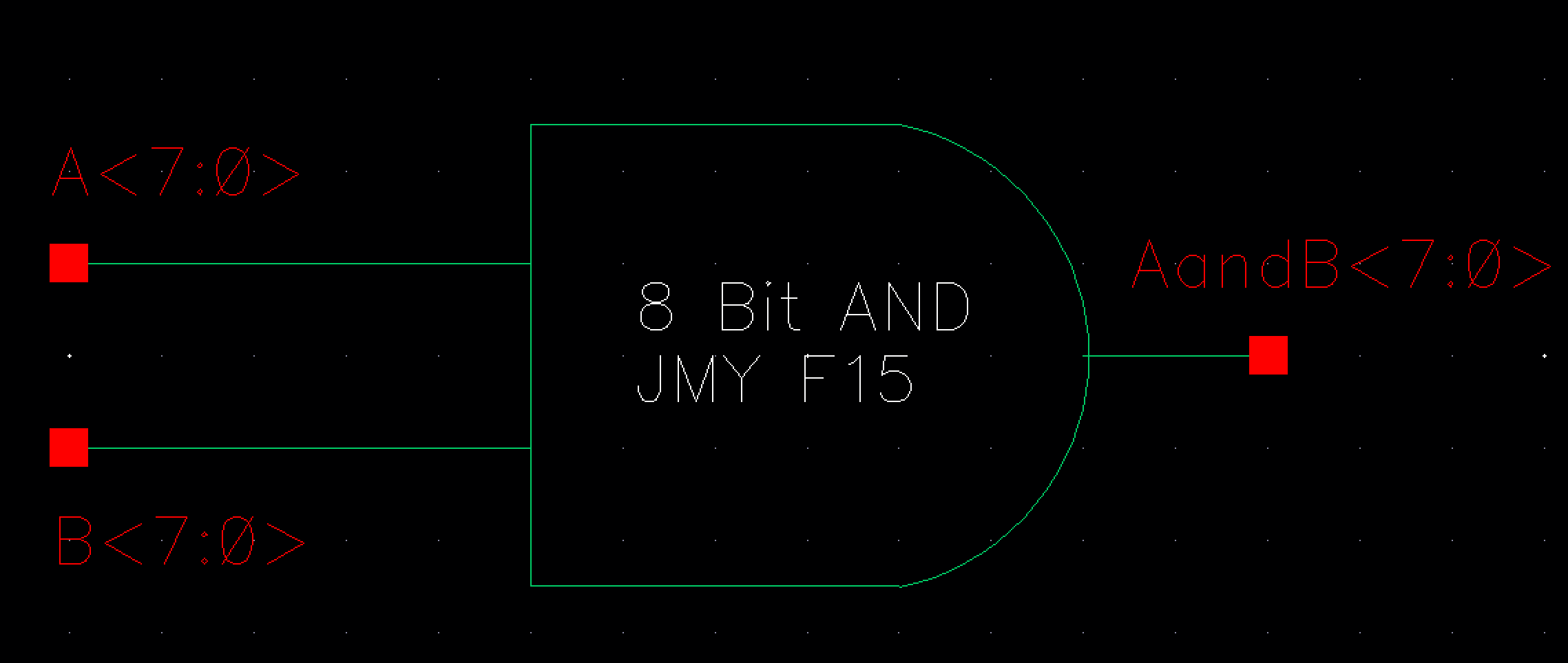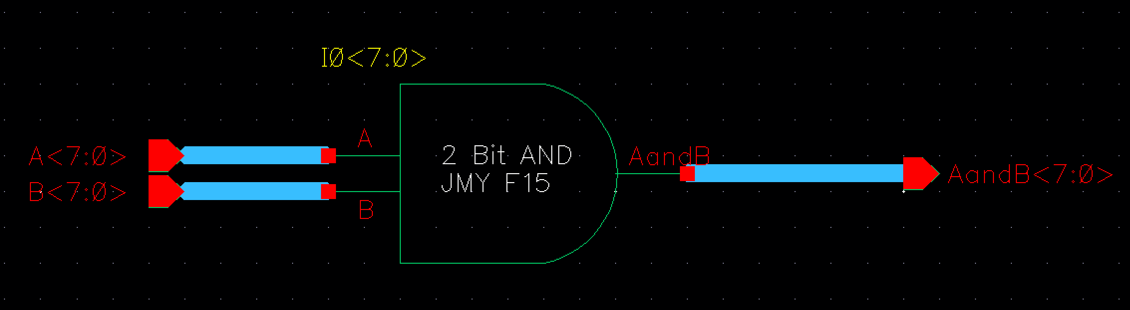 This image shows the schematic of an 8-bit AND gate, using the symbol in the previous figure for instantiation.