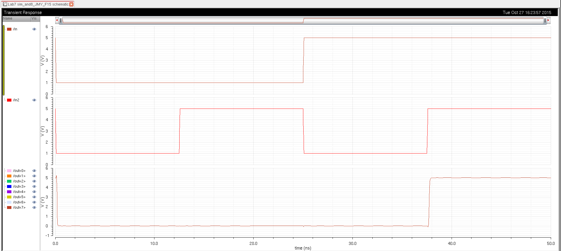 This image shows the successful simulation of the 8-bit AND gate schematic seen in the previous figure. Note: This simulation tests the following conditions: 00, 01, 10, and 11.