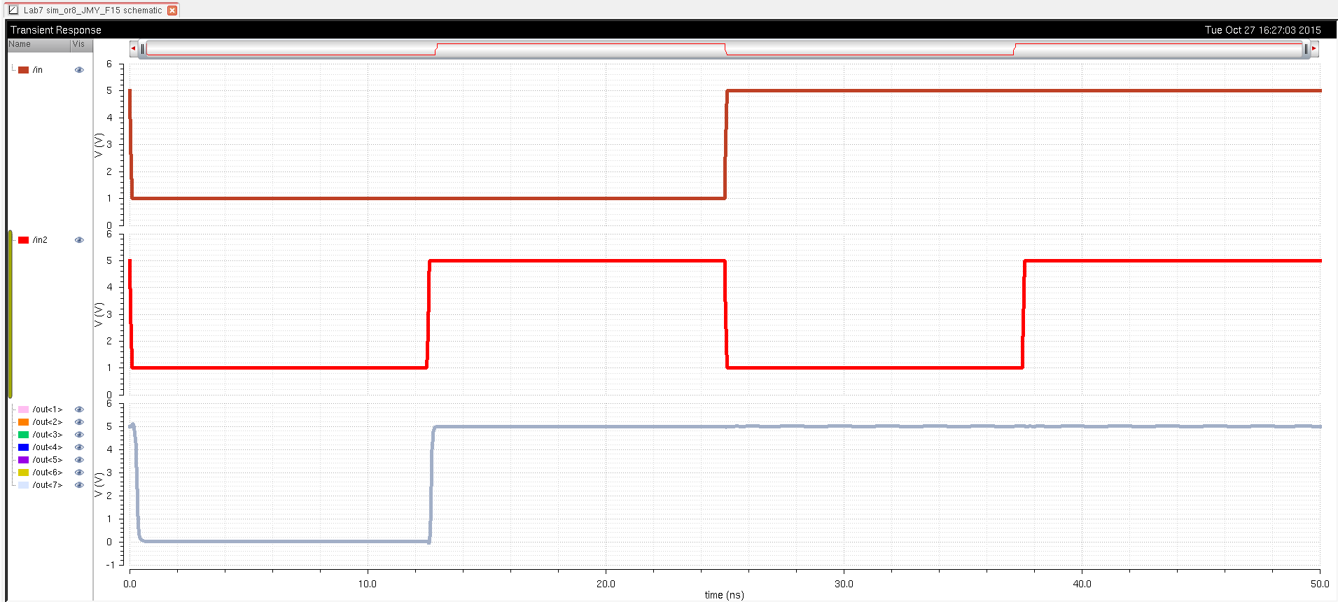 This image shows the successful simulation of the 8-bit OR gate schematic seen in the previous figure. Note: This simulation tests the following conditions: 00, 01, 10, and 11.