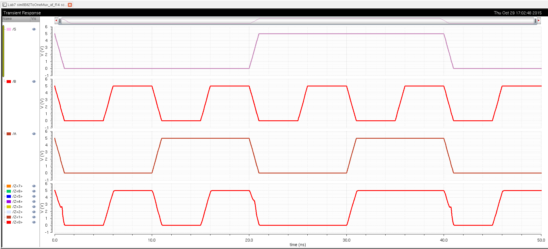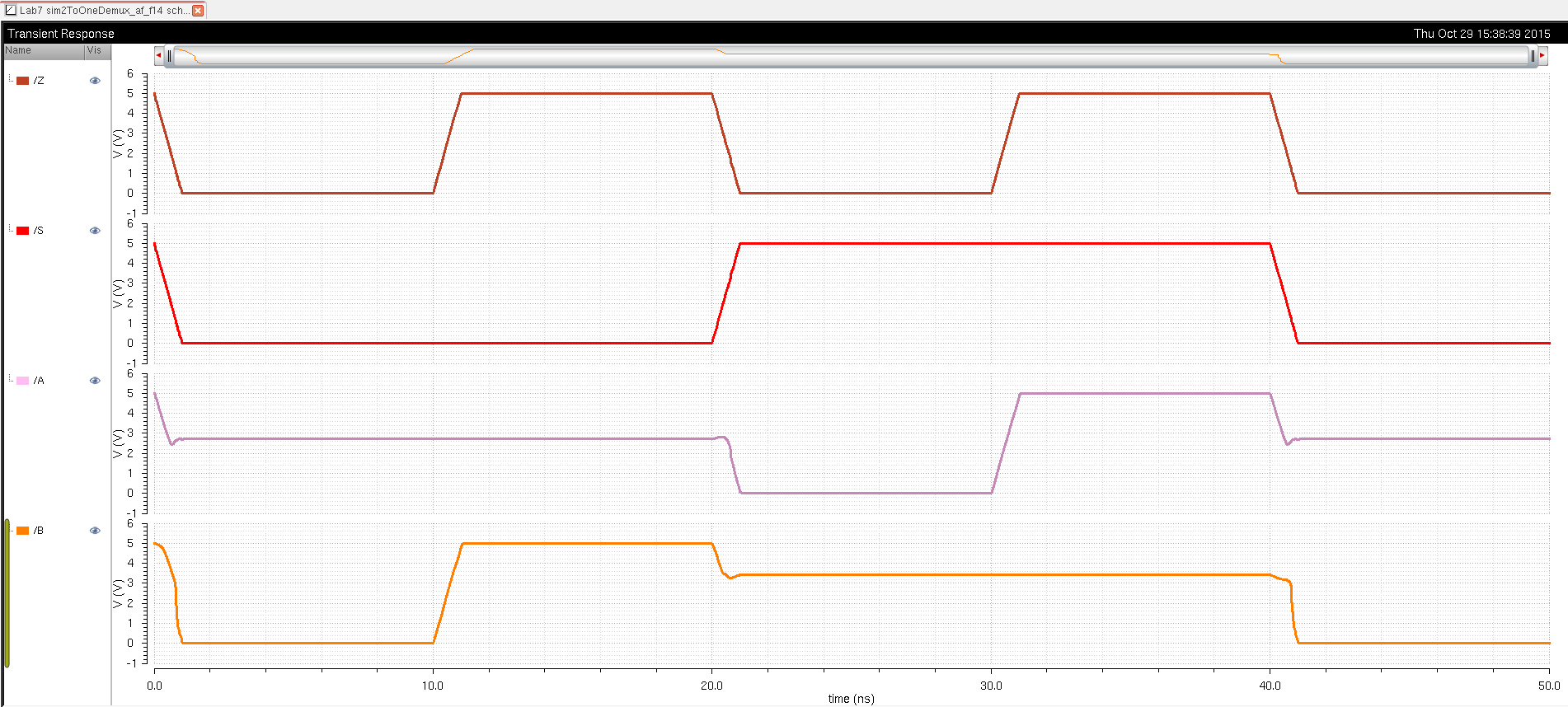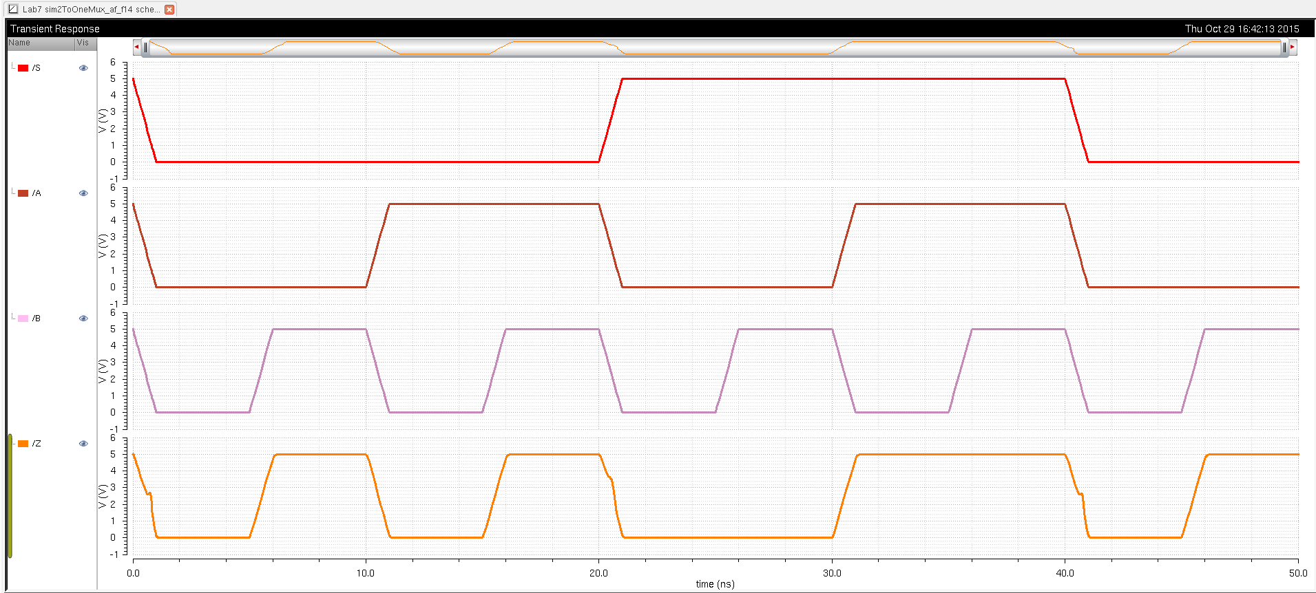 This image shows the simulation results produced from the previous figure. As one can see, when S is low the output, Z, is whatever B is. When S is high, the output, Z, is whatever A is as discussed at the beginning of this section.