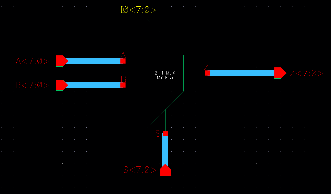 This image shows the simulation schematic of an 8-bit 2-to-1 MUX.