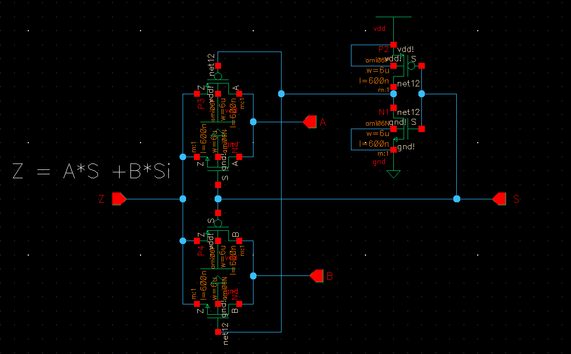 A 2-to-1 MUJX circuit works by activating (putting it high) the selection input, S, allows the output, Z, replicate the signal coming in from the input line A. If S is low, then Z will replicate the B input line. When replicating these lines, they will be exactly the same and thus any changes that occur on the input lines will be reflected on the output line depending upon which state S is in (high or low). This design is accomplished using MOSFETs, with the selection line S being inverted and allowing the PMOS holding back A to pass through to the output. Conversely, the NMOS connected to B is given the opposite of S, a low signal, and the PMOS of B is given a high input. This prevents the signal of B from passing through unless the S is low. When S is low, the inputs to B's NMOS and PMOS are switched thus allowing B to pass through. This detail is evident in the images seen below.