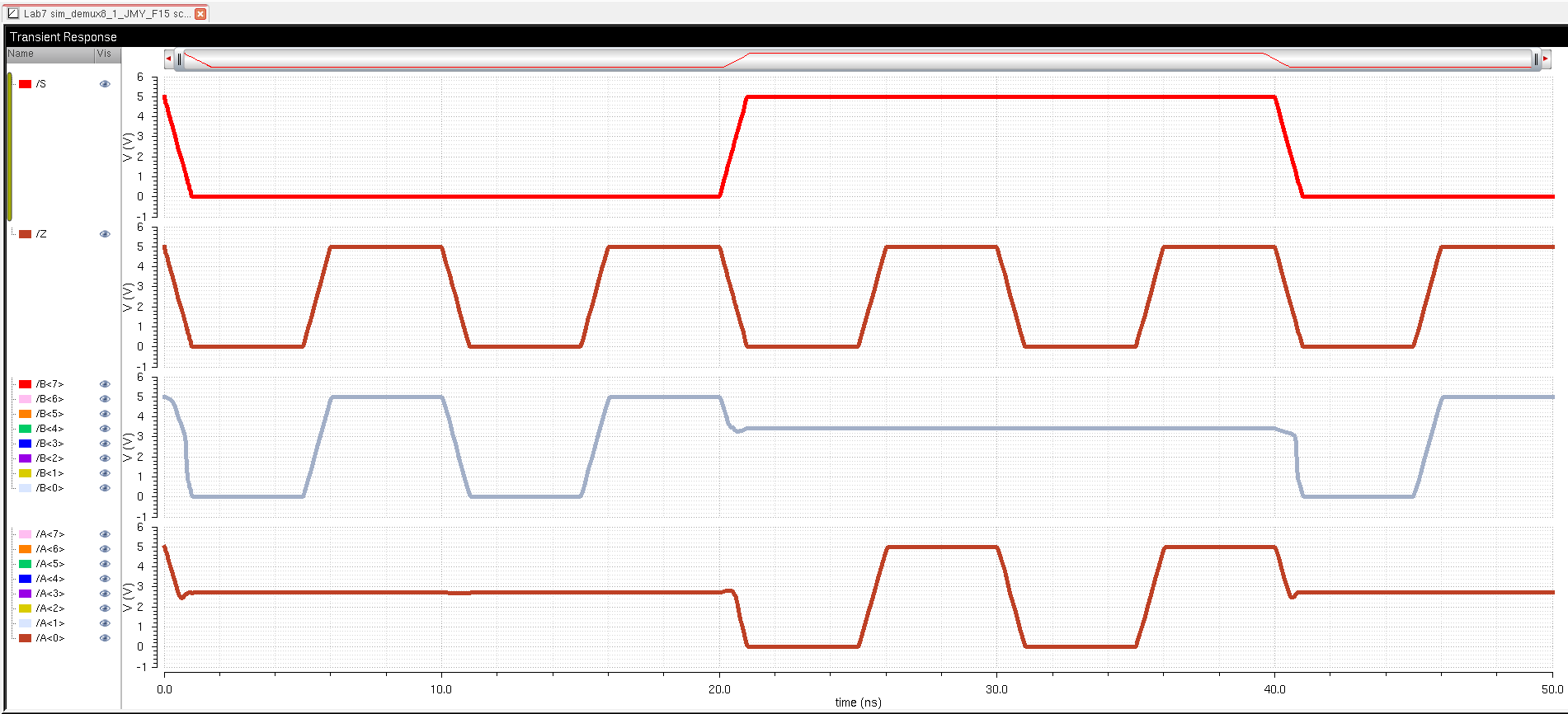 This image shows the simulation schematic of an 8-bit 2-to-1 DEMUX.