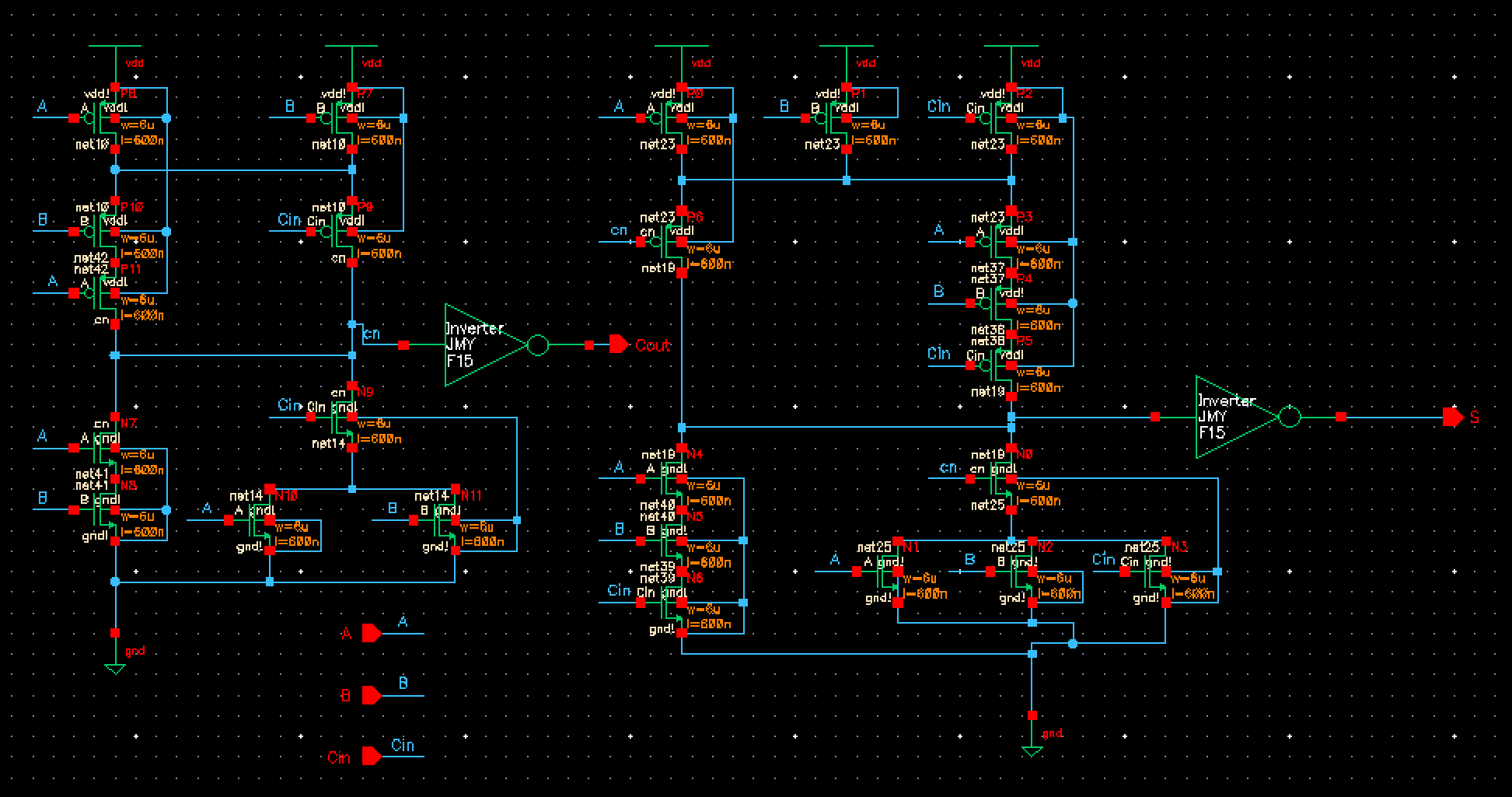 This section covers the design a full adder and its conversion into an 8-bit full adder, including the layout. For additional information on the full adder, including how it works, reference the full-adder section from lab 6 by clicking here.
